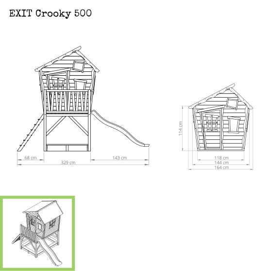 EXIT Crooky 500 legehus i træ i grå-beige med rutsjebane og sandkasse er en cool 'bjælkehytte', hvor børn kan tilbringe timevis af sjov. Dette legehus i træ står på ben, og de præfabrikerede paneler giver dig mulighed for at samle legehuset på ingen tid. EXIT Crooky 500 legehus i træ har et naturligt look og et sjovt design, herunder skrå vinduer, et skråt tag og en skrå dør.